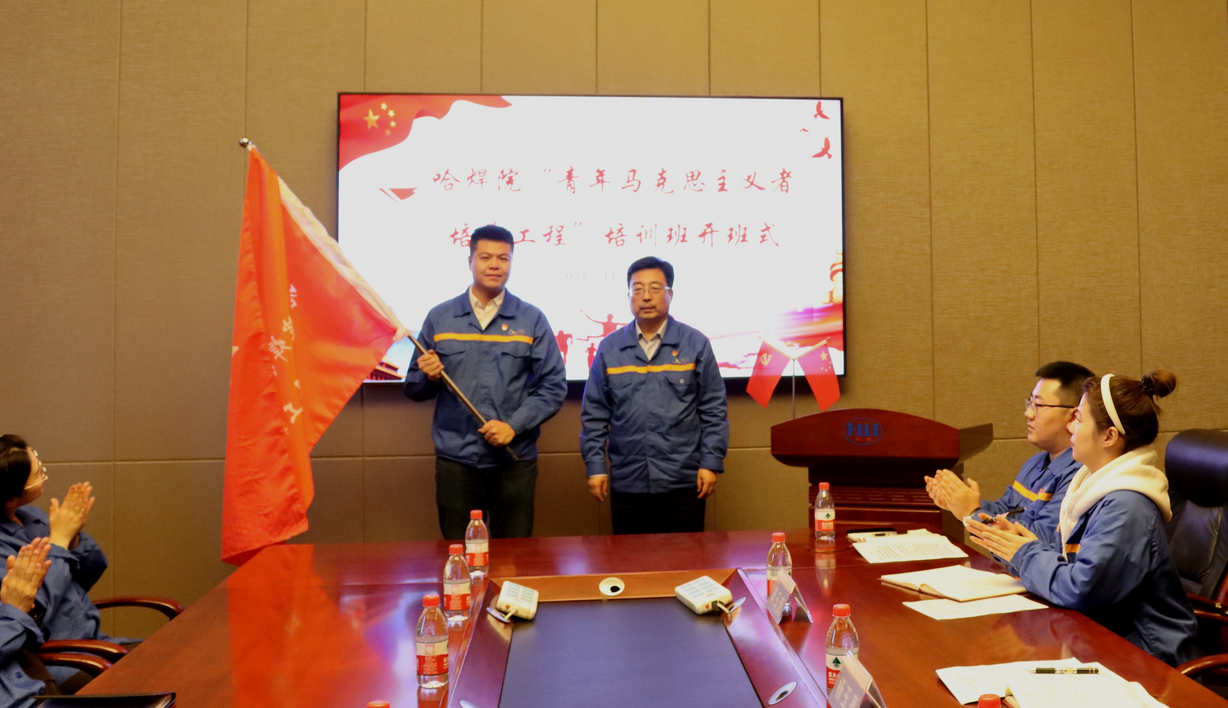 開班式在雄壯的國歌聲中拉開序幕,雷振同志介紹了“青馬工程”的歷程及重要意義,同時介紹了《哈焊院青年馬克思主義者培養工程實施方案》。班長郝龍宇詳細介紹了《2021年哈焊院“青馬工程”培養計劃》。隨后,楊玉亭同志為“青馬工程”培訓班授旗,學員代表烏彥全、付傲作表態發言,充分表達聽黨話、跟黨走,砥礪奮進、激揚青春,做堅定的馬克思主義者的決心。